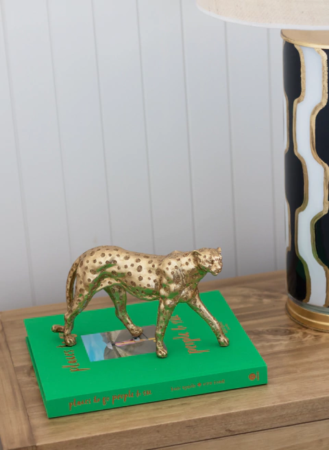 Figura de Guepardo en color dorado. Es ideal para decorar consolas o cómodas de entrada, acompañada por plantas u otros objetos deco! También puede usarse sobre alguna pila de libros o revistas en mesas laterales, mesas de centro o bibliotecas.