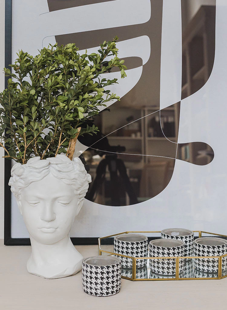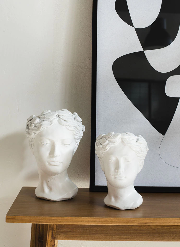 Cabeza romana con base realizada en cemento en color blanco. Es ideal para decorar consolas o cómodas de entrada, acompañada de floreros o jarrones de diferentes medidas aportando un look único al espacio. También puede ubicarse en escritorios o bibliotecas.