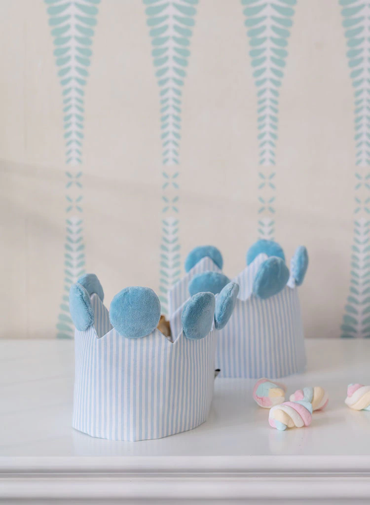 Corona realizada en tela con rayas celestes, lunares celestes de terciopelo y cinta.