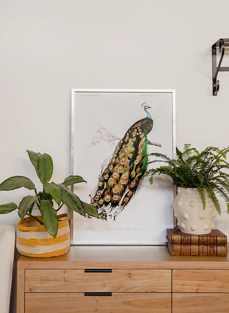 Cuadro con lámina de diferentes aves de colores, con blanco blanco y negro en marco plateado a la hoja. Son ideales para usar juntos sobre consolas, cómodas de entrada o sobre algún escritorio en áreas de descanso aportando personalidad a cualquier espacio.