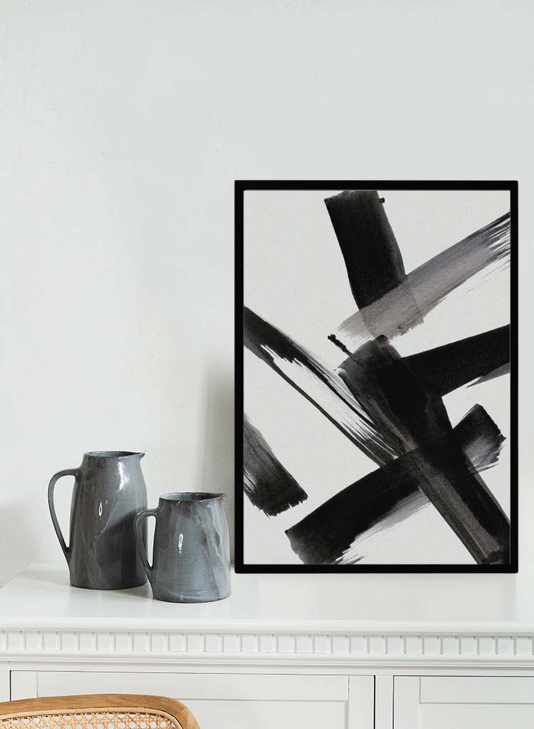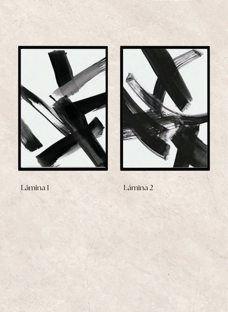 Serie de dos cuadros con lámina de manchas en negro y marco negro cajón. Su diseño aporta un look sofisticado y canchero a cualquier espacio, ideales para usar juntos sobre escritorios, arriba de alguna cómoda o sillones de living.