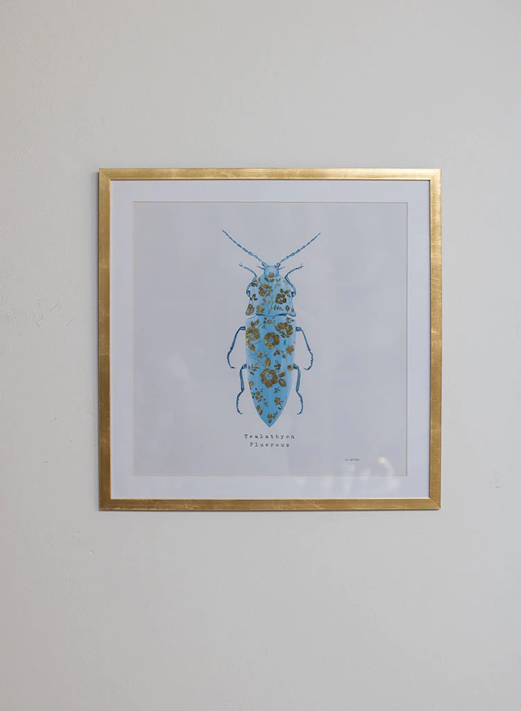 Cuadro con lámina de insecto Azul en fondo blanco con paspartú en marco varilla chata con terminación dorado a la hoja. Es ideal para usar solo apoyado o colgado sobre consolas o cómodas de entrada, sobre escritorios o vajilleros. También puede usarse junto a otras láminas de Insecto, en livings armando un espacio original y protagónico.