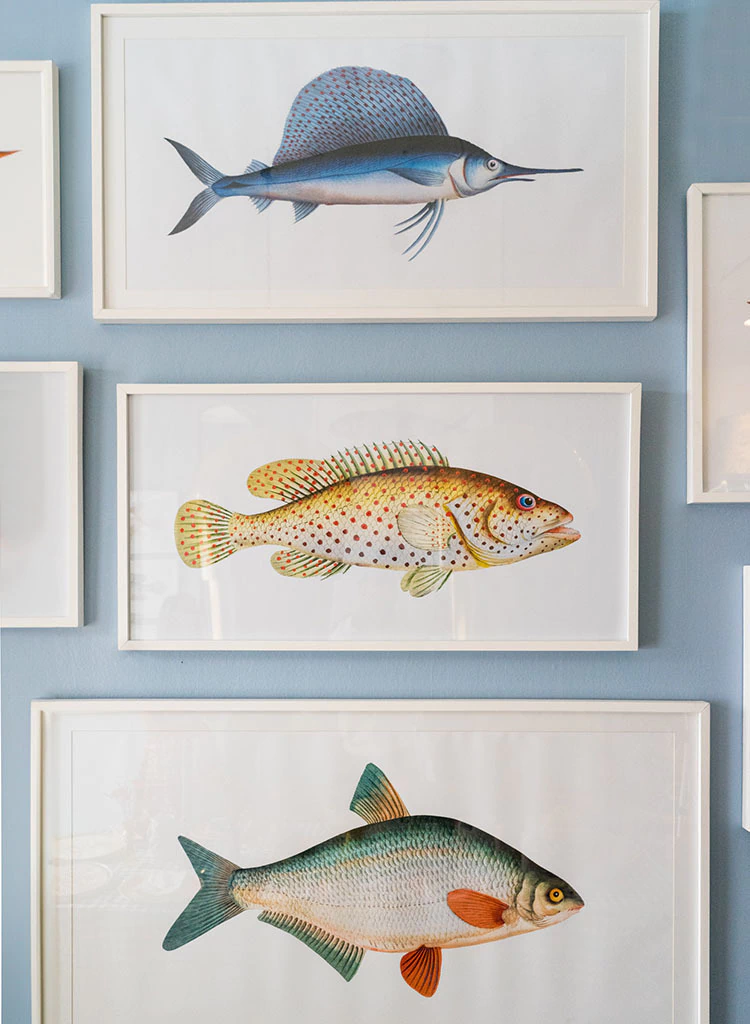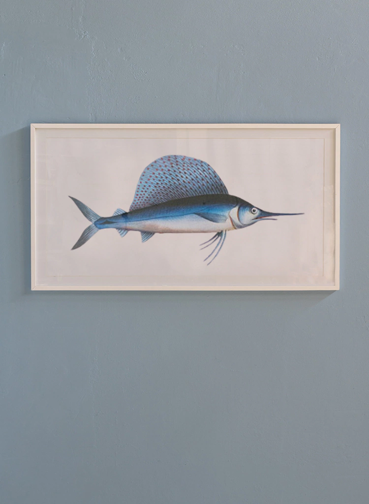 Cuadro con lámina de Pez Espada Azul (Lámina 7) con paspartú en color blanco y marco blanco cajón. Ideal para usar juntos arriba de una cómoda o consola, aportando un look fresco y descontracturado a cualquier ambiente.