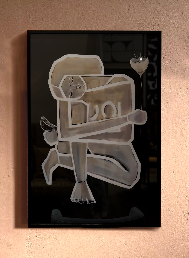 Cuadro abstracto con figura femenina en tonos tierra y líneas blancas, que remite a una postura introspectiva y envolvente. Con un estilo contemporáneo y algo cubista, esta obra aporta profundidad visual y carácter a cualquier espacio. Ideal para colocar sobre un aparador oscuro, en una oficina moderna o en un rincón de lectura con luz cálida. Aporta un aire sofisticado y contemplativo a tu ambiente.