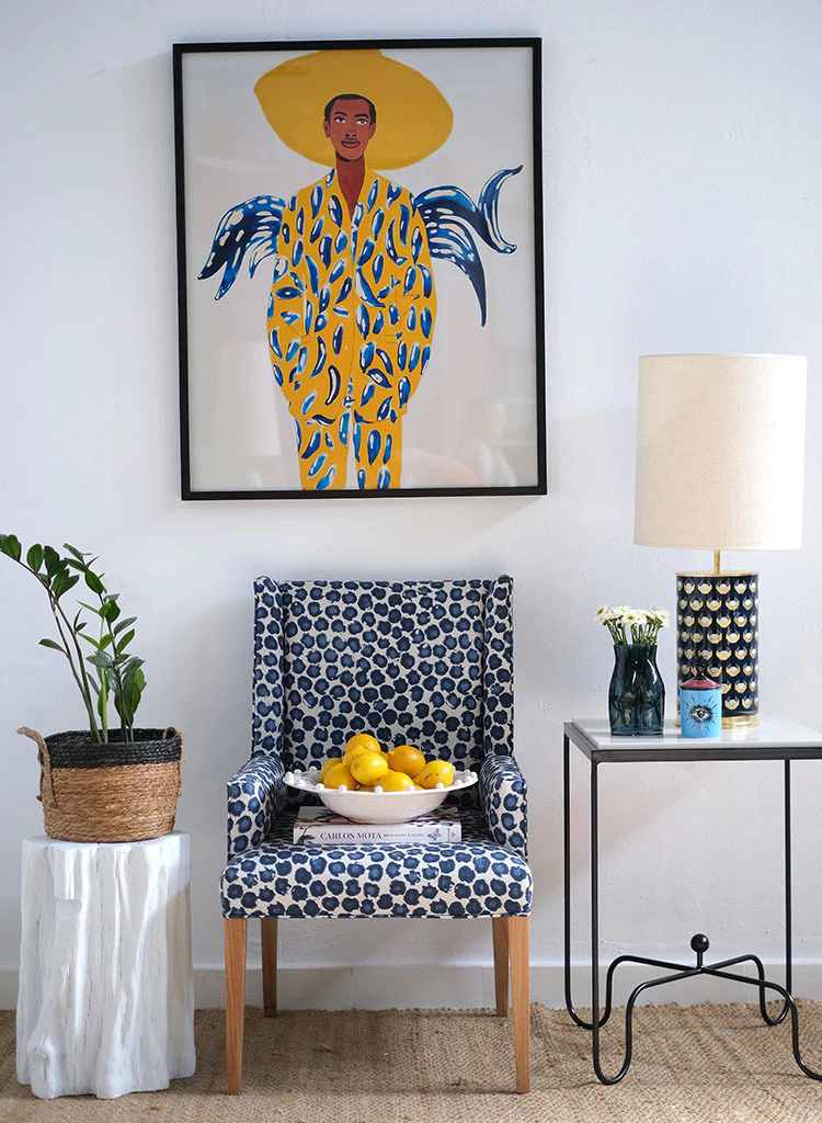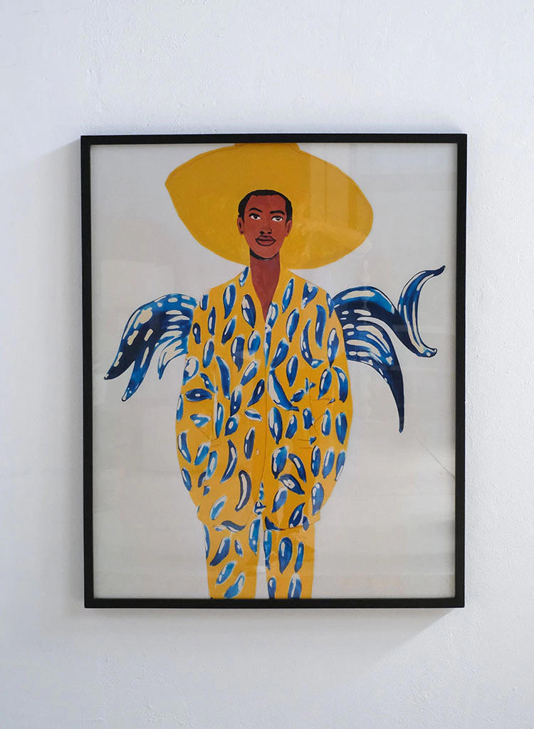 Este cuadro presenta una figura masculina estilizada, vestida con un traje amarillo vibrante adornado con detalles azules que crean un patrón audaz y llamativo. La figura lleva un sombrero grande que resalta su presencia imponente, mientras que formas similares a alas en los hombros aportan un toque surrealista. Los colores cálidos y los elementos gráficos sugieren un ambiente soleado, evocando una mezcla de serenidad y fuerza. Ideal para espacios contemporáneos, combinando simplicidad y audacia en su expresión visual.