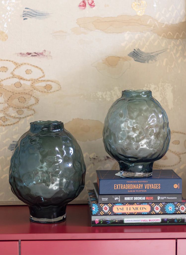 Florero de vidrio Basalto en color gris con una textura irregular que le da mucha personalidad. Su diseño robusto y de cuello corto lo convierte en una pieza escultórica por sí misma, ideal para usar en consolas o cómodas de entrada acompañado de flores o varas artificiales. También puede usarse en mesas de centro o comedor, puede ir combinado con otros de diferentes alturas, formas y colores armando un espacio protagónico.