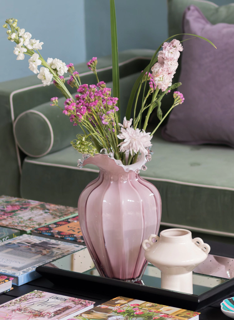 Florero de vidrio en color lila con terminación bolitas en el borde. Es ideal para usar en estanterías, mesas de centro, mesas de comedor o consolas acompañado de flores. También puede ir sobre alguna bandeja con velas y alguno de nuestros objetos inesperados!