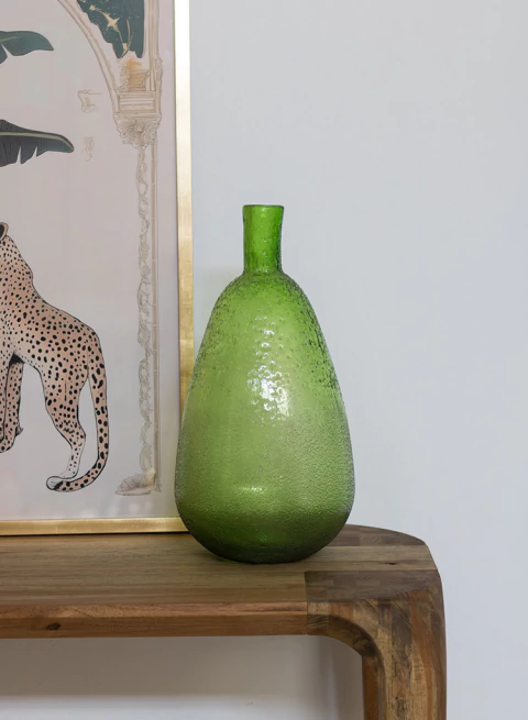 Un florero de vidrio irregular en color verde, con un diseño orgánico y detalles labrados que aportan textura y movimiento. Su estética versátil lo hace ideal para destacar arreglos florales o como pieza decorativa por sí sola, ideal para usar en consolas, mesas de centro, estanterías o bibliotecas.