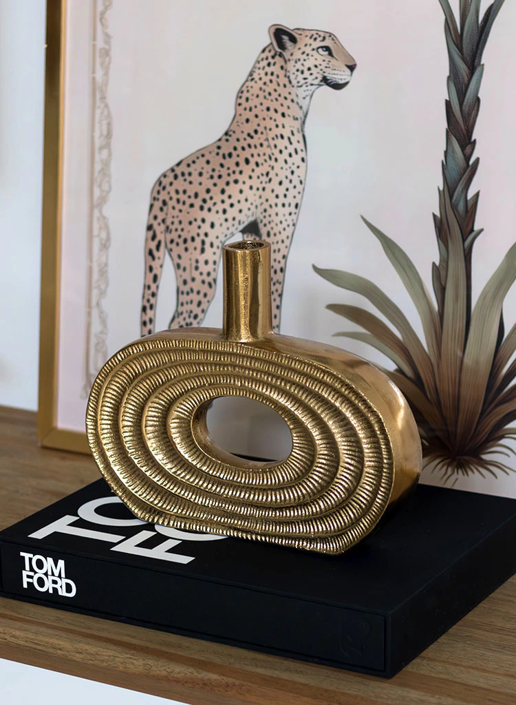 Jarrón / Potiche en forma ovalada en color dorado con detalles labrados. Este new arrival es ideal para usar en mesas de centro o comedor, sobre alguna bandeja acompañado por algún objeto inesperado, velas u otros floreros. También puede usarse sobre alguna pila de libros sobre mesas laterales o en consolas, estanterías o bibliotecas.