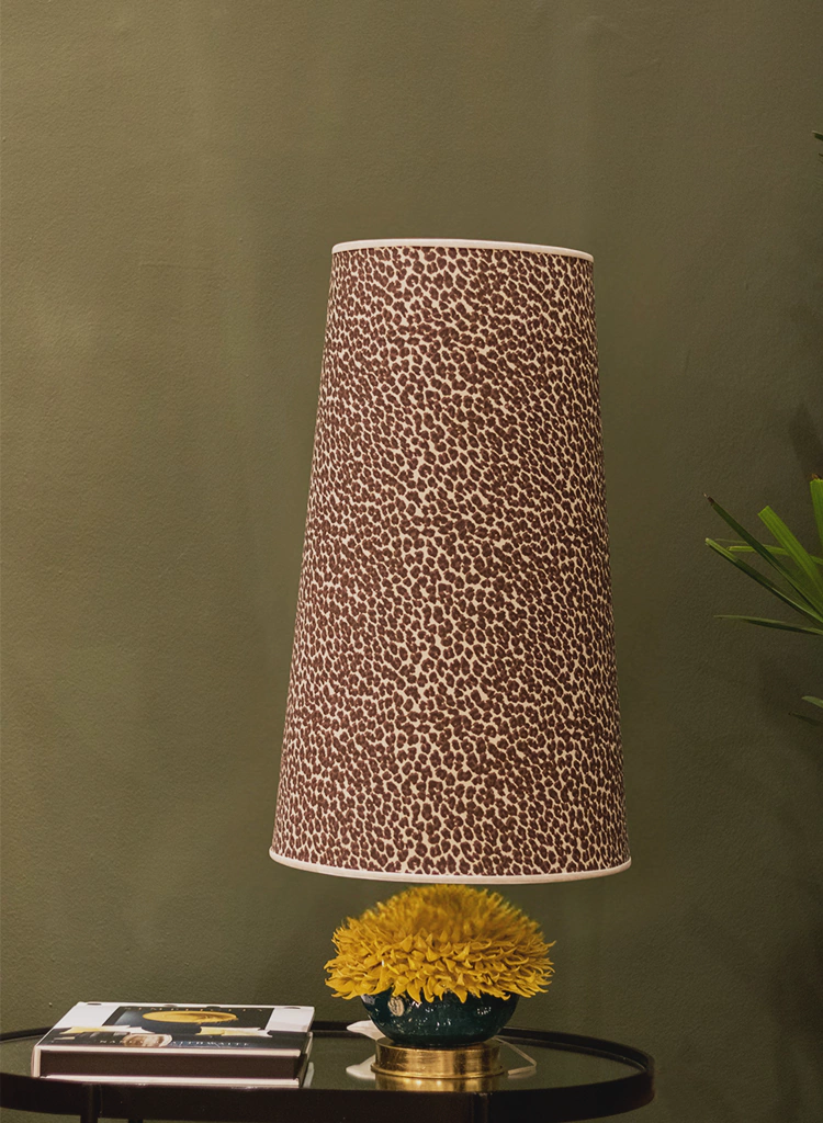 Lámpara Citrino, en cerámica en color verde y amarillo, aporta una impronta botánica y escultórica. La pantalla, con un estampado animal print en tonos tierra, genera contraste y dinamismo, logrando una pieza que no pasa desapercibida. Ideal para rincones con personalidad: desde mesas auxiliares hasta escritorios con estilo.