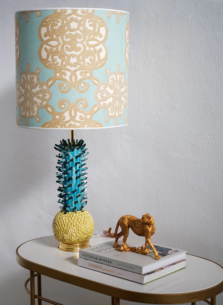 Cada lámpara de mesa Lis es una obra de arte, ya que están realizadas completamente a mano. Es un modelo original de cerámica con base color dorado, que brida textura y calidez a tus espacios. Ideal para decorar mesas laterales de living o consola de entrada. Recomendamos utilizarla con nuestra pantallas de diámetro 35 cm o tubo.