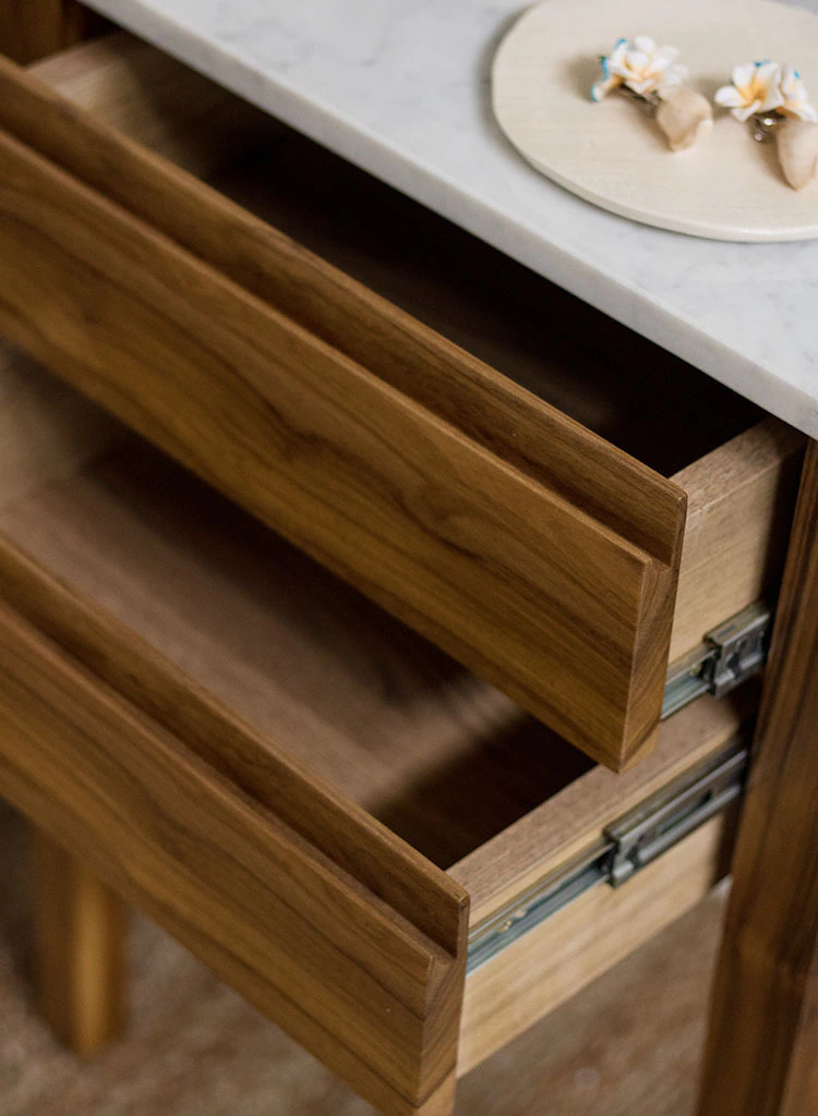 Estructura de madera Petiribí con hidrolaca poliuretánica santina y tapa realizada en mármol Carrara. Cuenta con dos cajones con guías telescopicas. La combinación de sus materiales y las vetas delicadas del mármol la hacen un modelo sofisticado y moderno, que aporta elegancia al ambiente!
