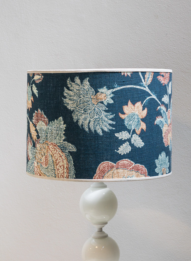 Pantalla Zafira de lona estampada, con un delicado diseño floral en tonos azules profundos, combinados con acentos suaves en beige y terracota. Su estética elegante y envolvente aporta calidez y personalidad, logrando un equilibrio entre lo clásico y lo sofisticado. Es ideal para usar con nuestro modelo de lámpara de pie Molly o hernestina, aportando un look elegante a cualquier ambiente!