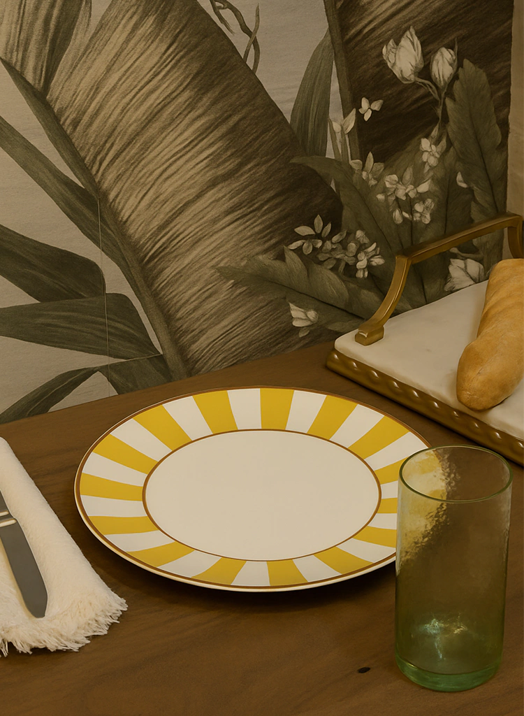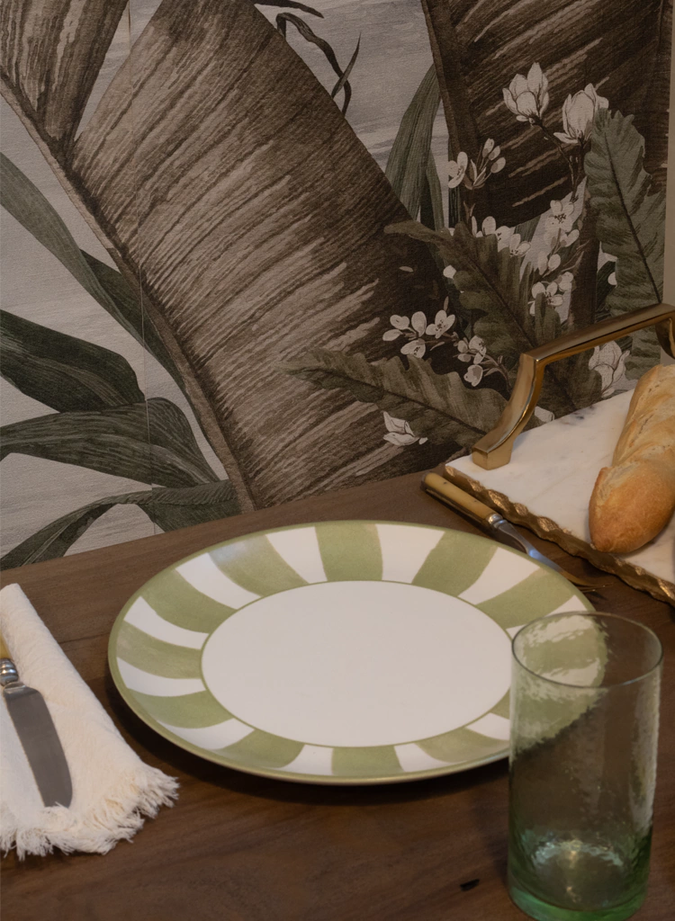 Plato de cerámica artesanal principal blanco y verde con rayas. Es una pieza única con todo el encanto de la vajilla artesanal.