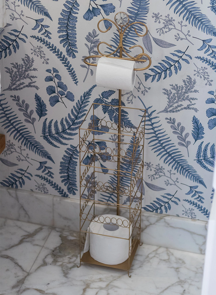 Elegante y práctico portarrollo de pie con estructura metálica. Diseñado para sostener un rollo en uso y almacenar repuestos en su base, mateniendo siempre organizado con estilo.Se adpata facilmente a cualquier rincón, ideal para sumar detalle.