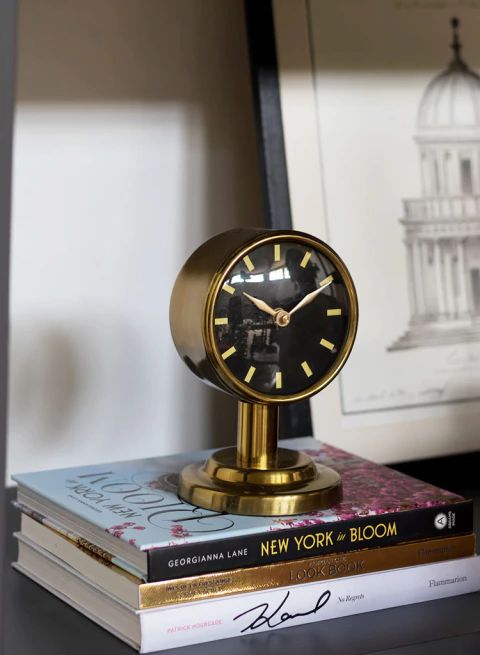 Reloj de mesa en color dorado con fondo negro. Es ideal para usar sobre las mesas de luz en habitaciones. También puede usarse como objeto deco arriba de alguna pila de libros en una mesa lateral, escritorios, estanterías o bibliotecas.
