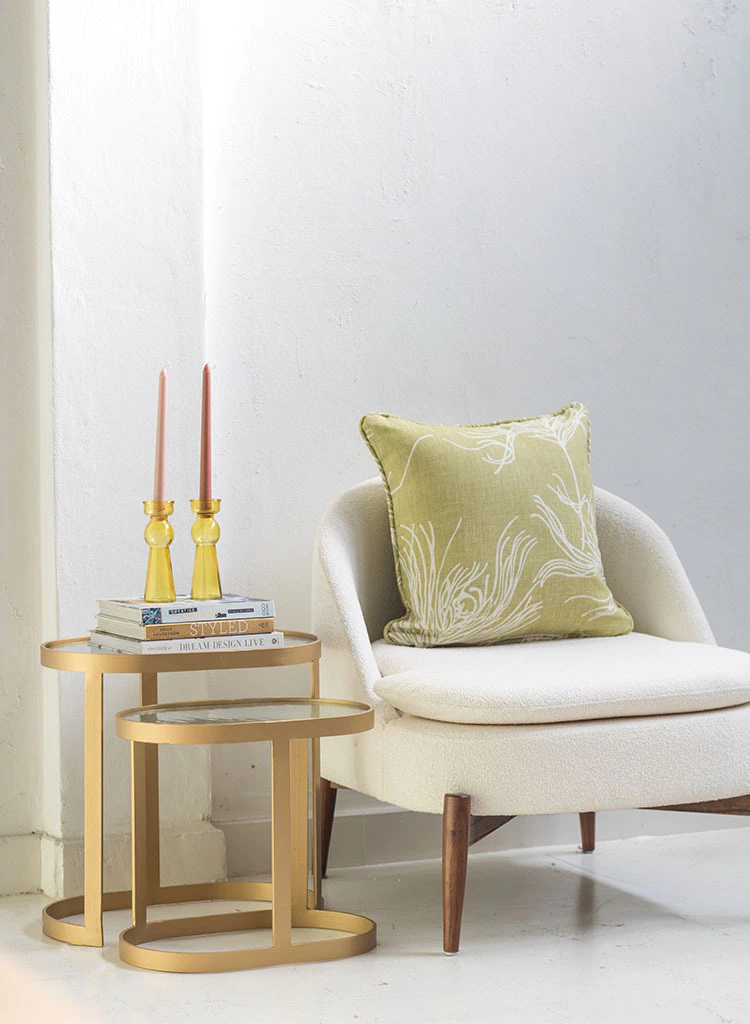 Estructura y base de hierro en color dorado, con tapas de vidrio en terminación Martele. Hacen parte de nuestra Pueden usarse como mesas laterales o de apoyo en livings o rincones de luz, son un modelo moderno que aporta sofisticación a cualquier espacio.