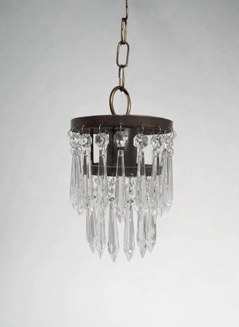 Doble estructura de hierro en color oxidgo rodeada con caireles de vidrio que caen generando dos capas uniformes de brillo que iluminan con perfecta elegancia.